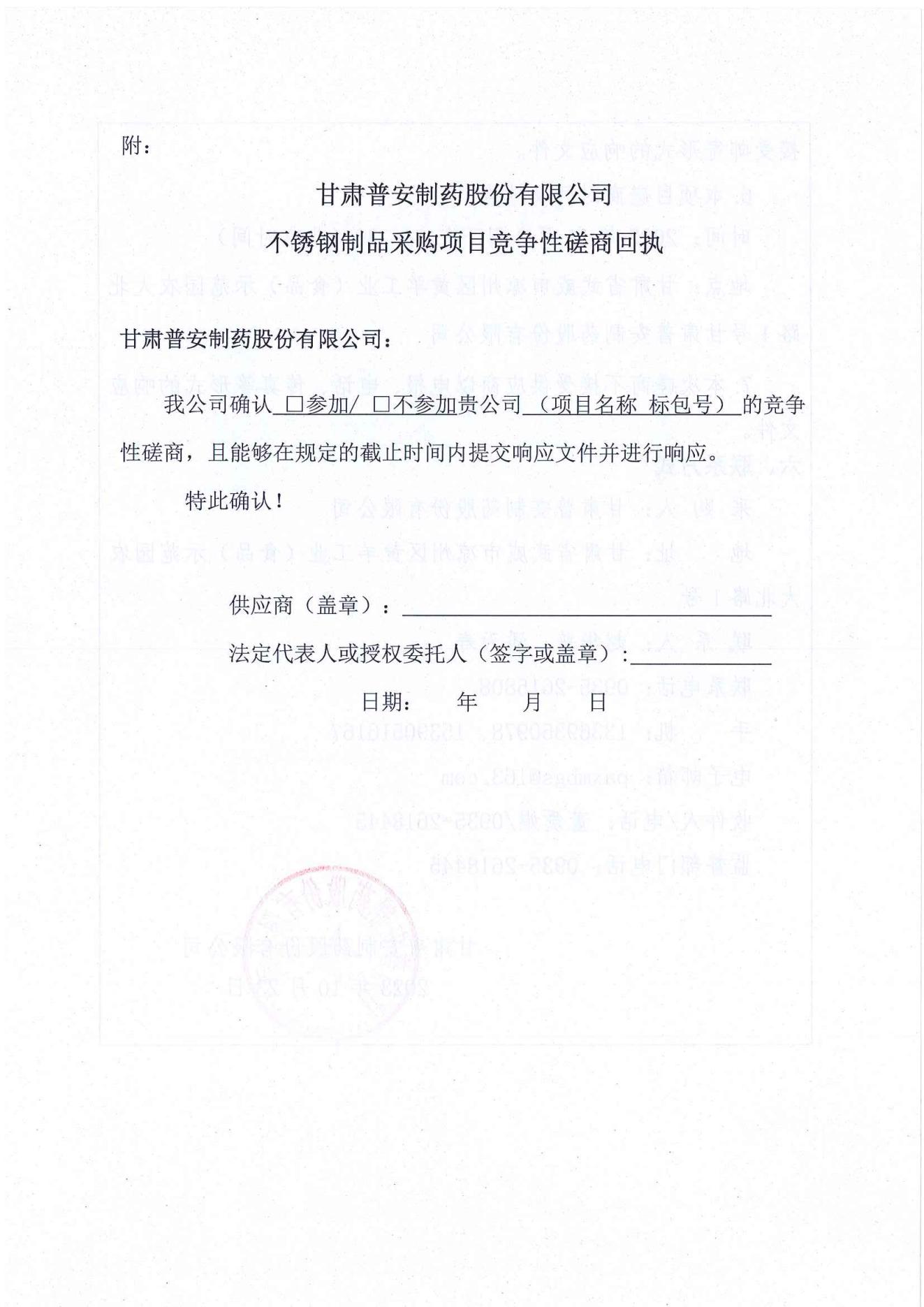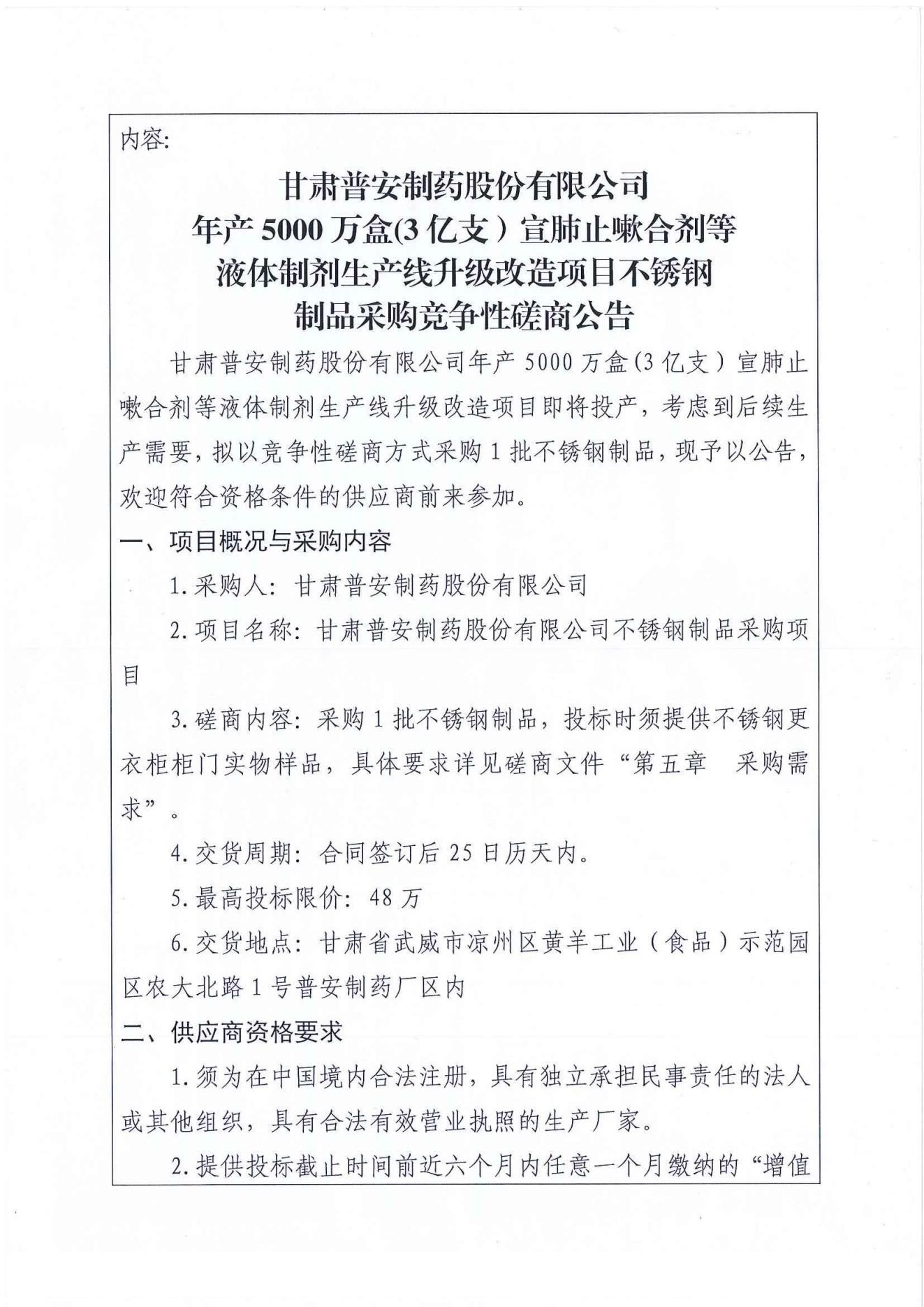 甘肅普安制藥股份有限公司年產(chǎn)5000 萬盒(3億支)宣肺止嗽合劑等液體制劑生產(chǎn)線升級改造項(xiàng)目不銹鋼制品采購競爭性磋商公告