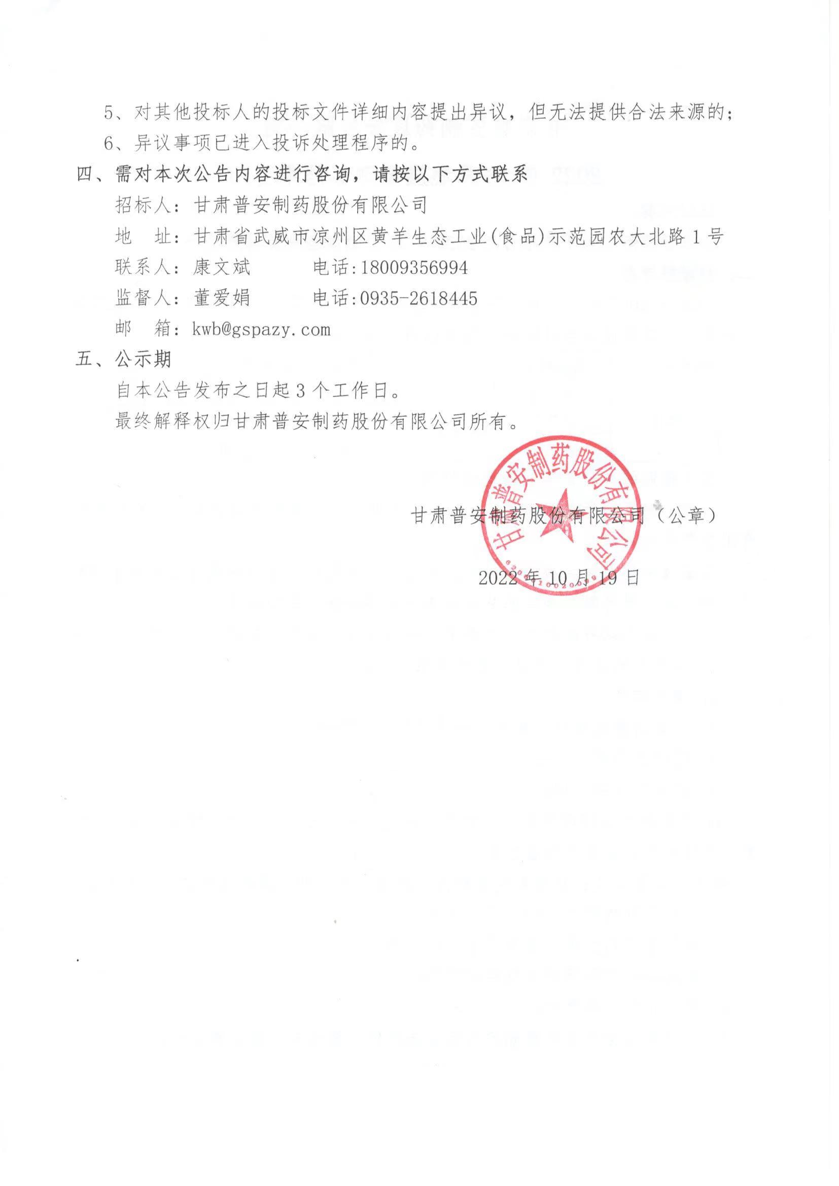 甘肅普安制藥股份有限公司2022年10月燃煤招評標(biāo)結(jié)果的公示