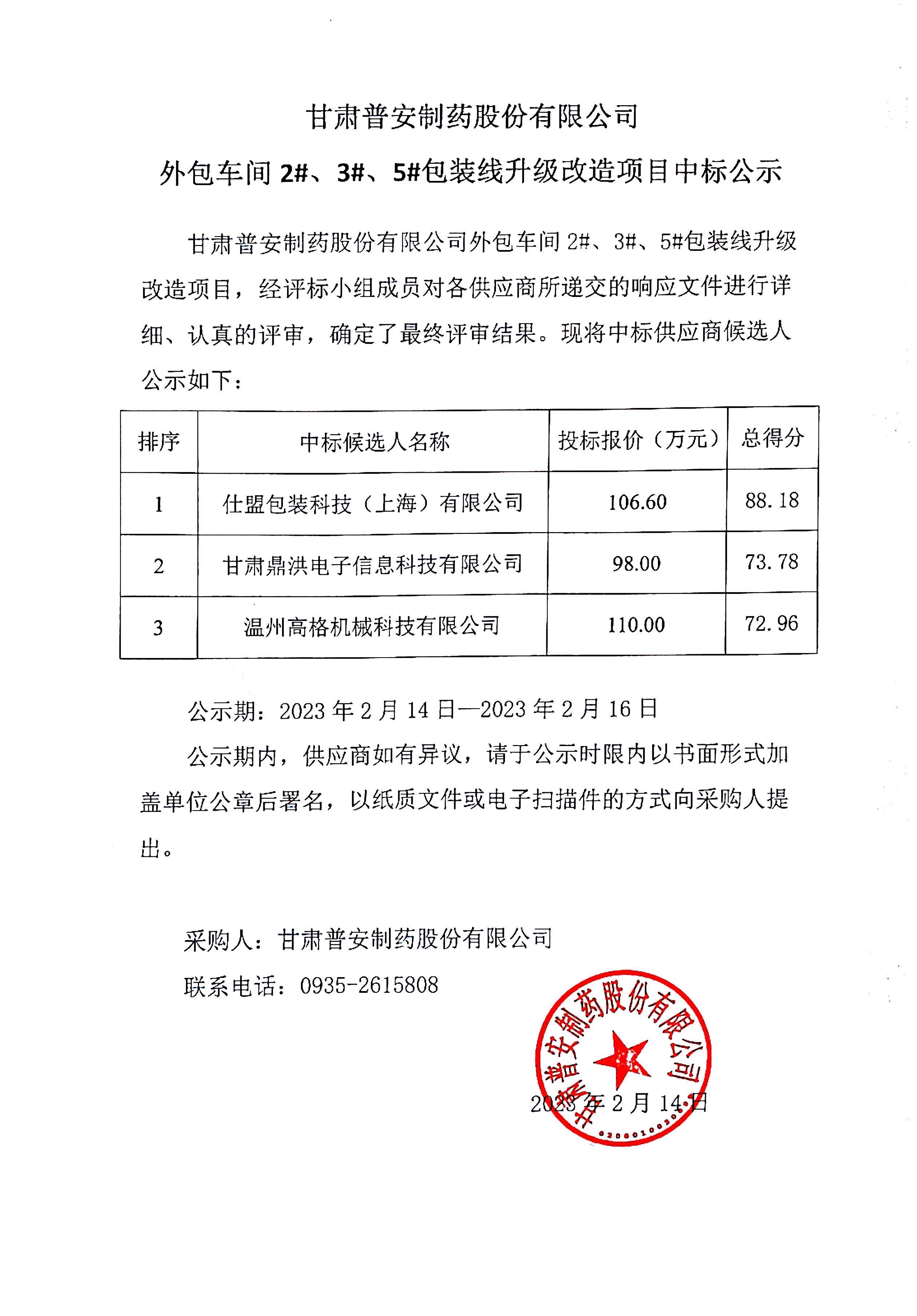 甘肅普安制藥股份有限公司外包車間2#、3#、5#包裝線升級(jí)改造項(xiàng)目中標(biāo)公示