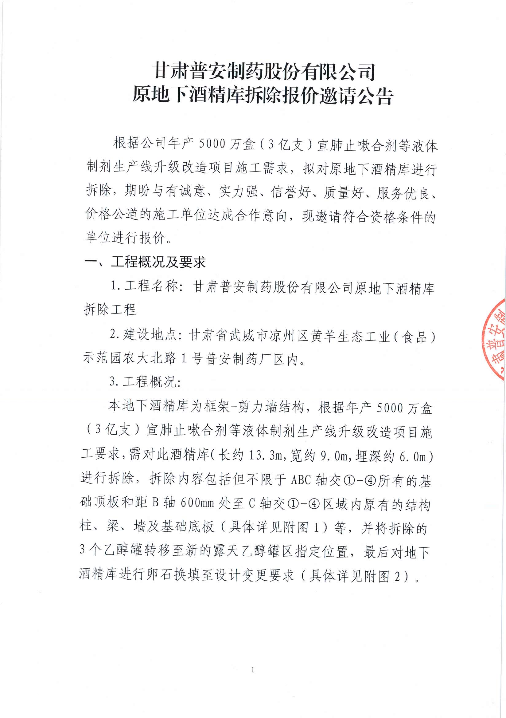 甘肅普安制藥股份有限公司原地下酒精庫(kù)拆除報(bào)價(jià)邀請(qǐng)公告