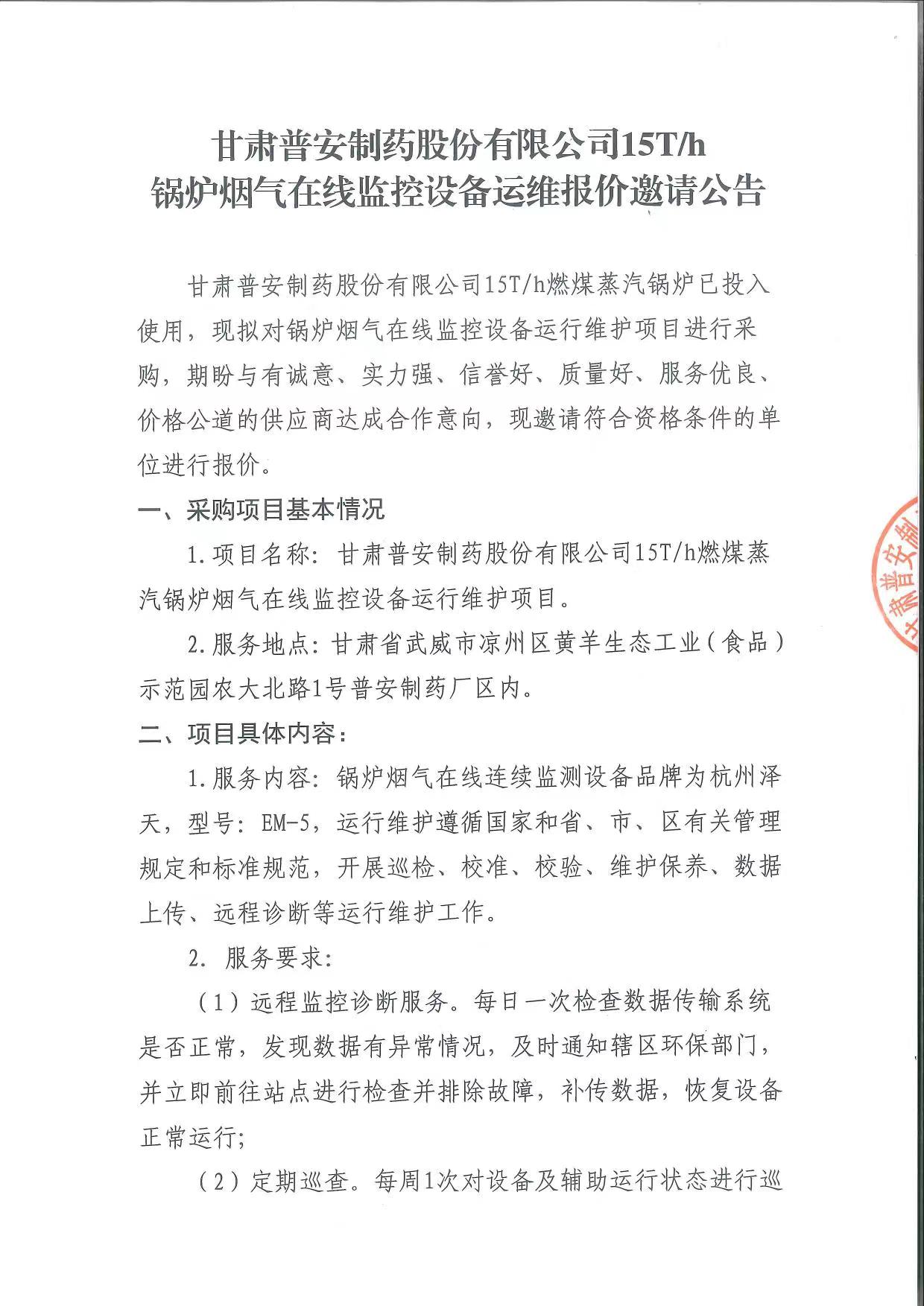 甘肅普安制藥股份有限公司15T/h鍋爐煙氣在線監(jiān)控設(shè)備運維報價邀請公告