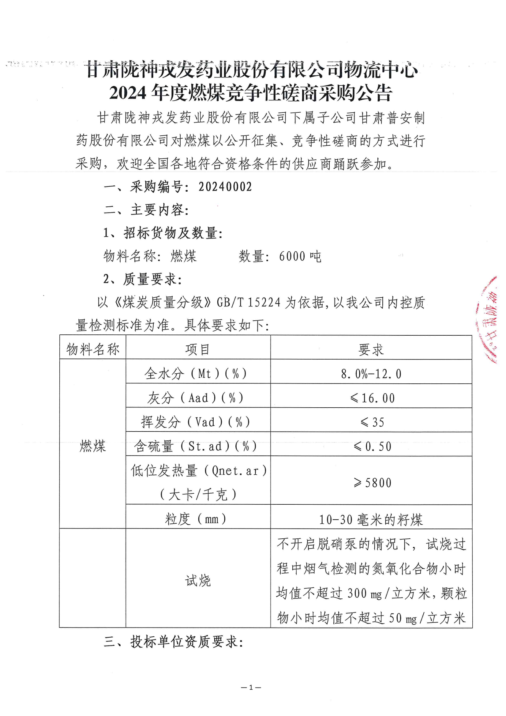 甘肅隴神戎發(fā)藥業(yè)股份有限公司物流中心2024年度燃煤競(jìng)爭(zhēng)性磋商采購(gòu)公告