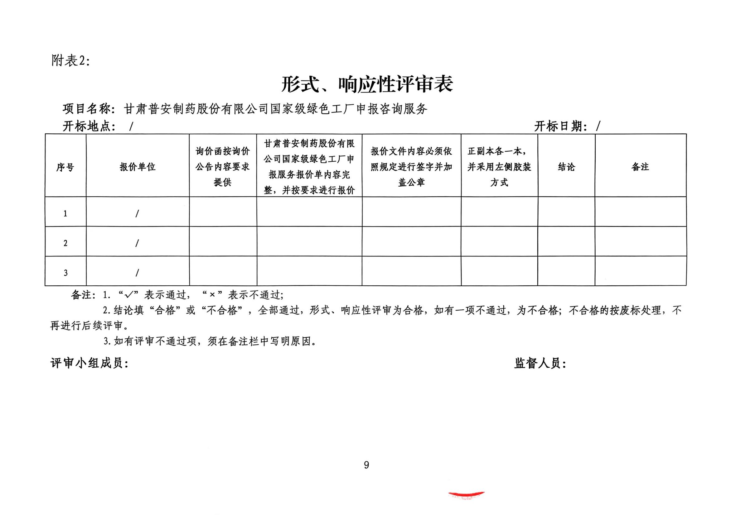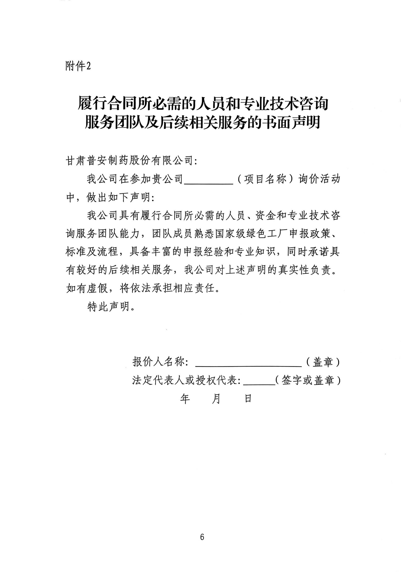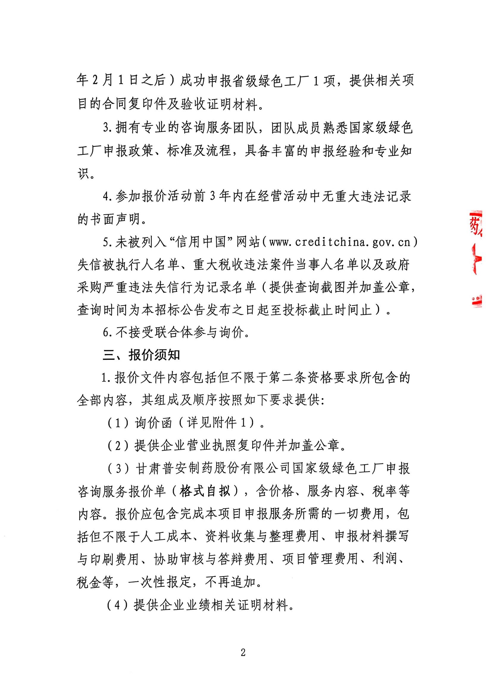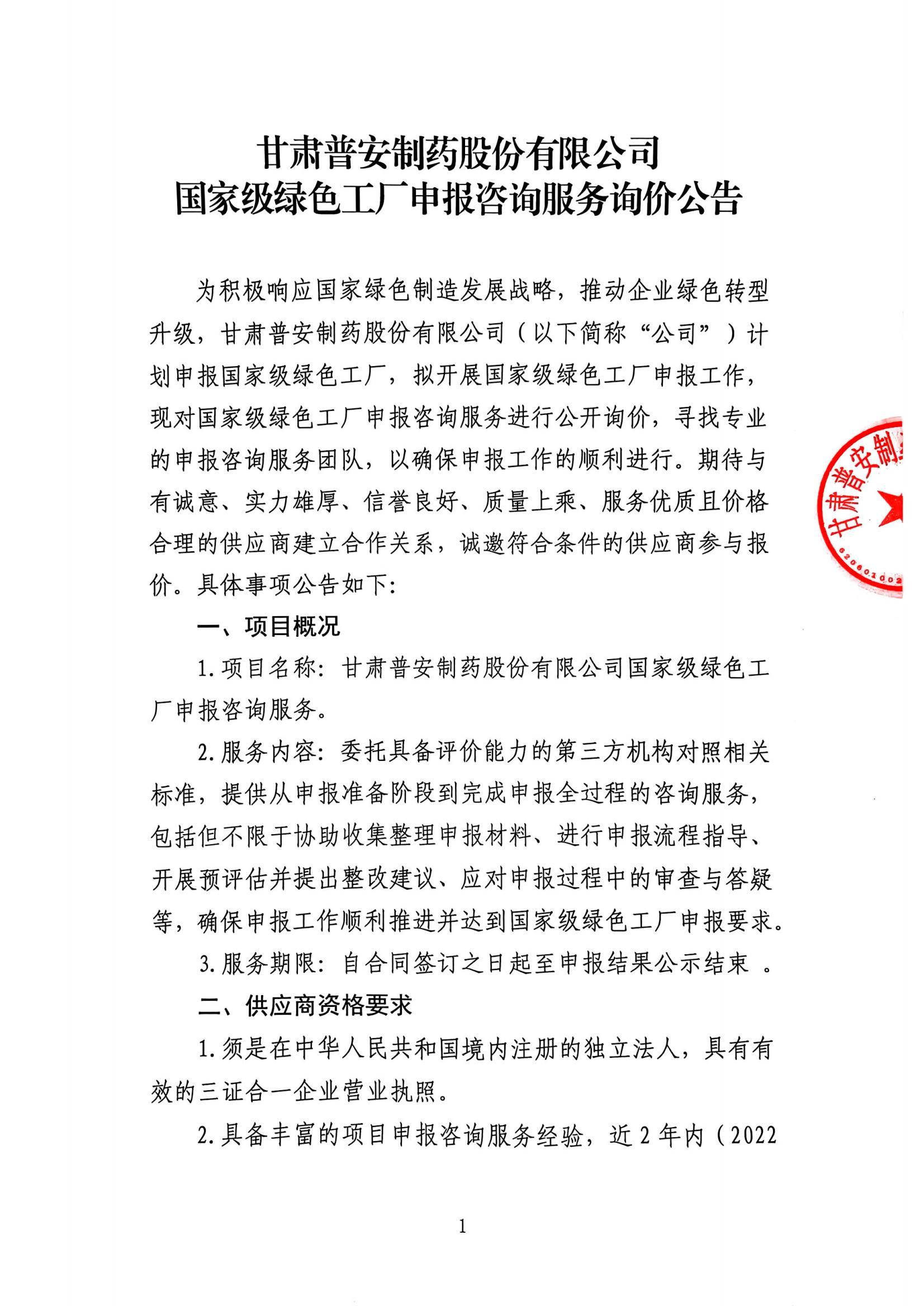 甘肅普安制藥股份有限公司國家級綠色工廠申報咨詢服務(wù)詢價公告