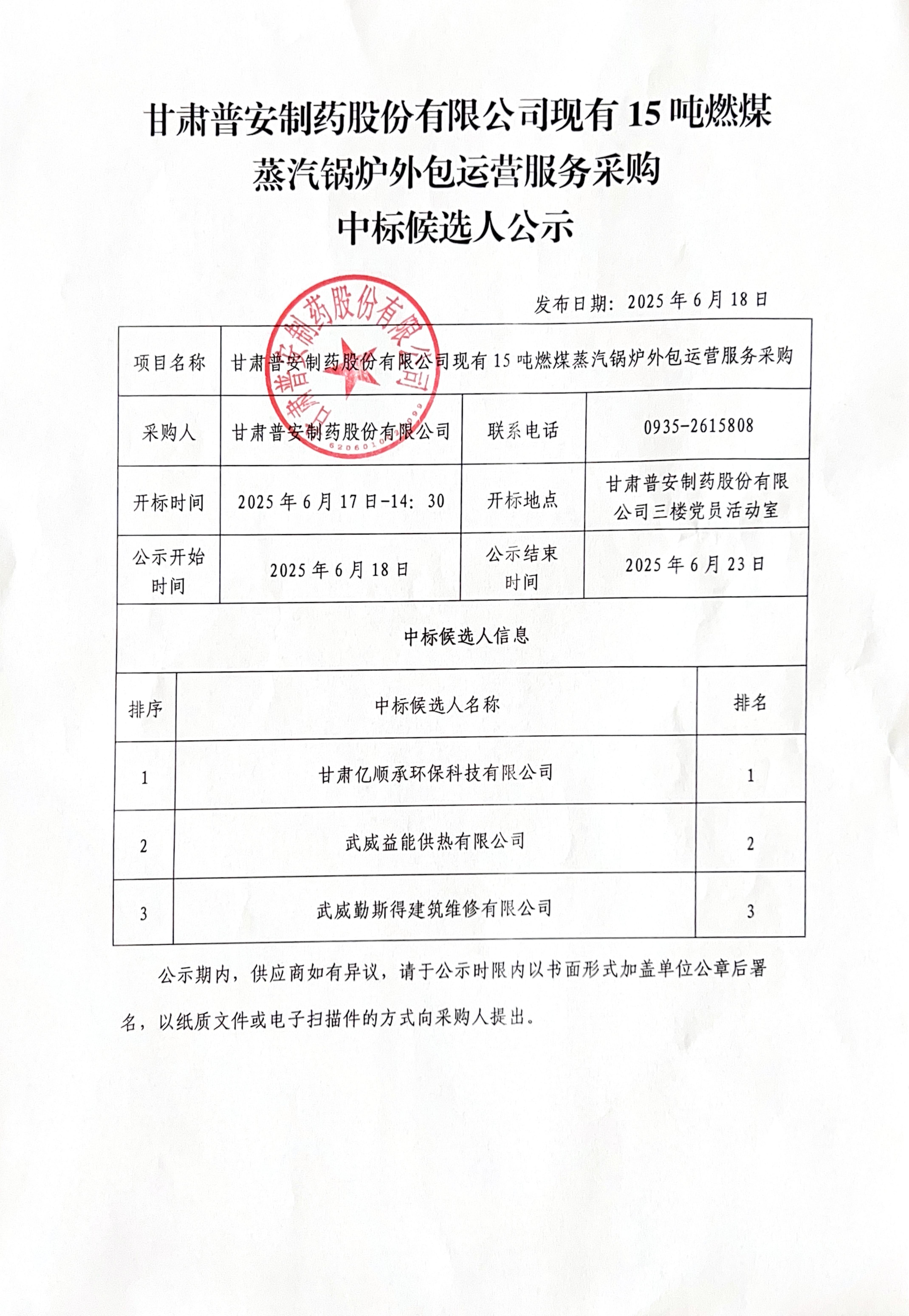 甘肅普安制藥股份有限公司現(xiàn)有15噸燃煤 蒸汽鍋爐外包運(yùn)營服務(wù)采購中標(biāo)候選人公示