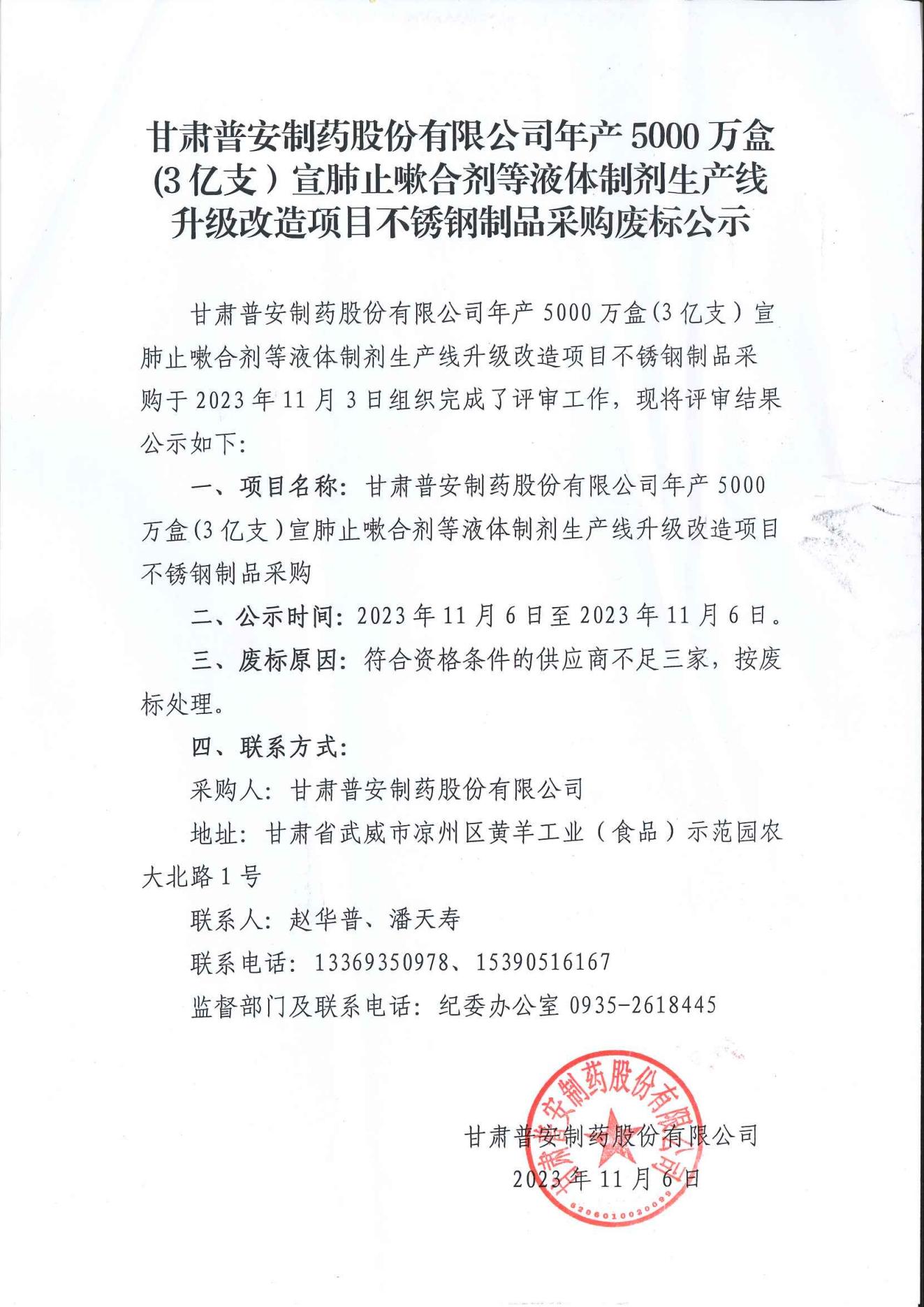 甘肅普安制藥股份有限公司年產(chǎn)5000萬盒(3億支)宣肺止嗽合劑等液體制劑生產(chǎn)線升級改造項目不銹鋼制品采購廢標公示