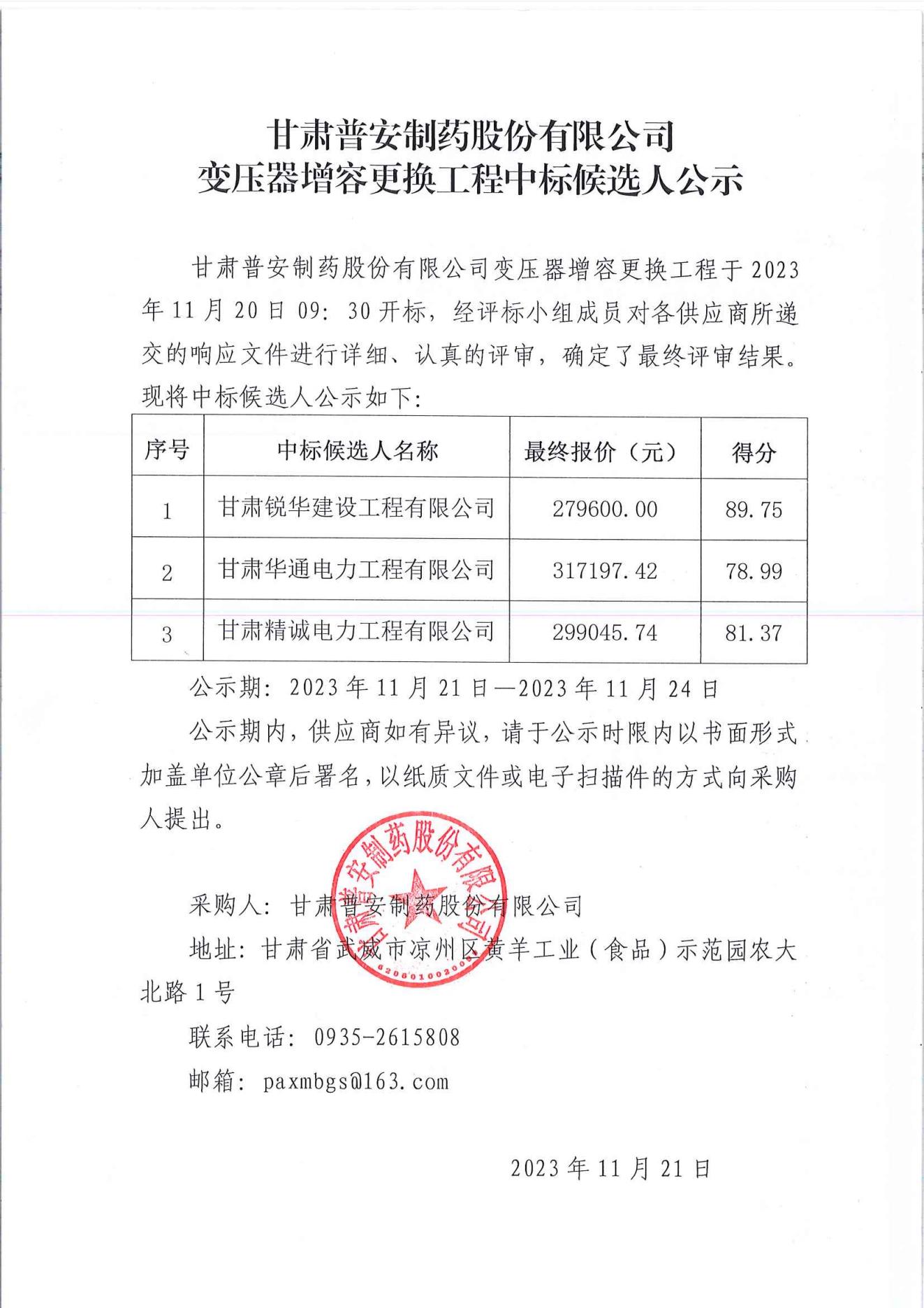 甘肅普安制藥股份有限公司變壓器增容更換工程中標候選人公示