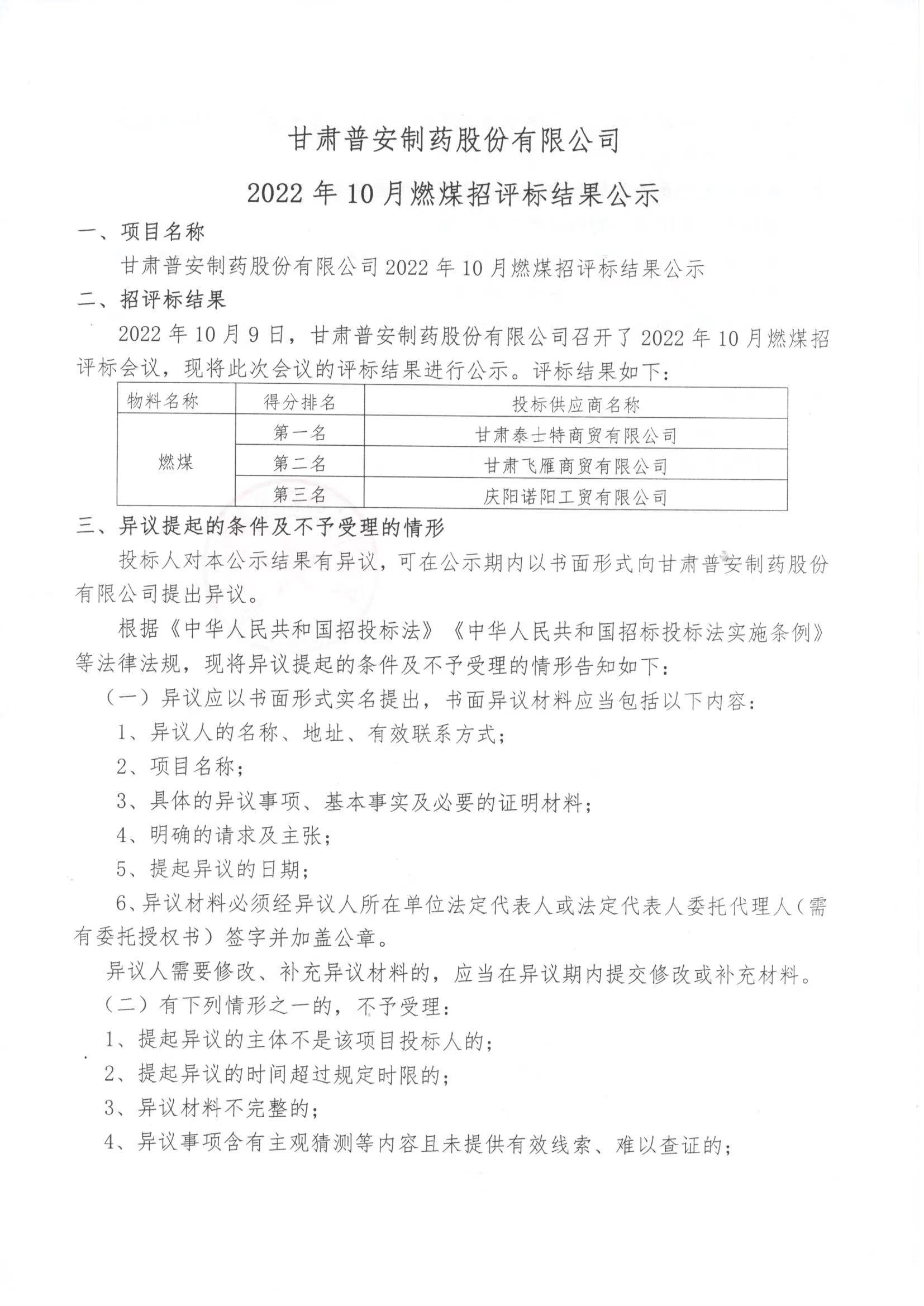 甘肅普安制藥股份有限公司2022年10月燃煤招評標(biāo)結(jié)果的公示
