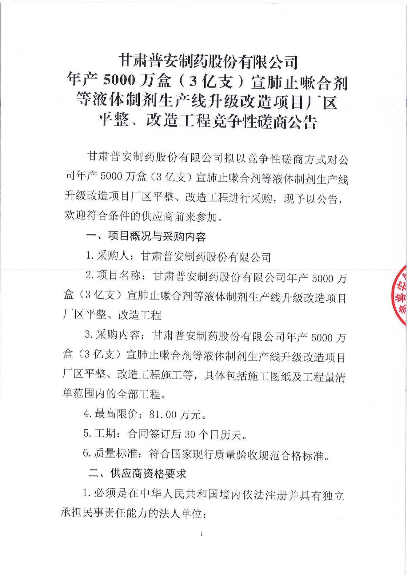 甘肅普安制藥股份有限公司年產(chǎn)5000萬(wàn)盒(3億支)宣肺止嗽合劑等液體制劑生產(chǎn)線升級(jí)改造項(xiàng)目廠區(qū)平整、改造工程競(jìng)爭(zhēng)性磋商公告
