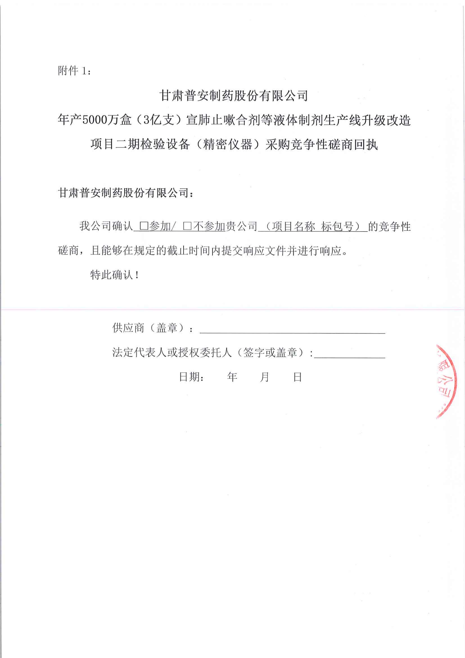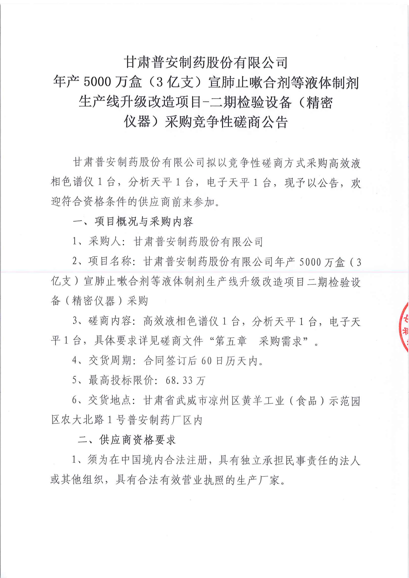 甘肅普安制藥股份有限公司年產(chǎn)5000萬盒(3億支)宣肺止嗽合劑等液體制劑生產(chǎn)線升級改造項(xiàng)目二期檢驗(yàn)設(shè)備(精密儀器)采購競爭性磋商公告