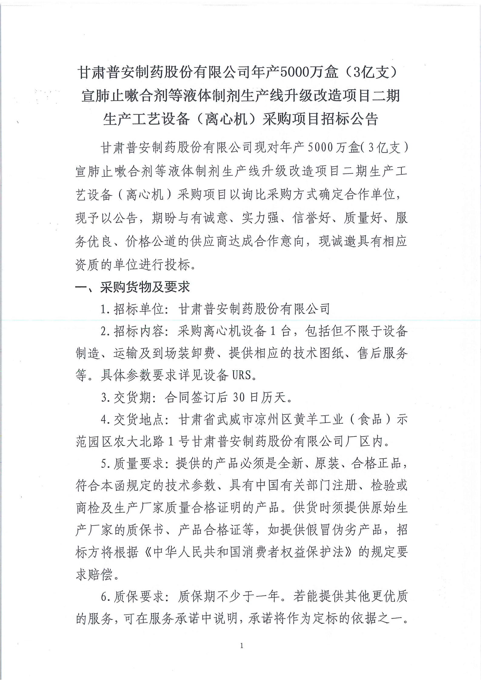 甘肅普安制藥股份有限公司年產(chǎn)5000萬盒(3億支)宣肺止嗽合劑等液體制劑生產(chǎn)線升級(jí)改造項(xiàng)目二期生產(chǎn)工藝設(shè)備(離心機(jī))采購(gòu)項(xiàng)目招標(biāo)公告