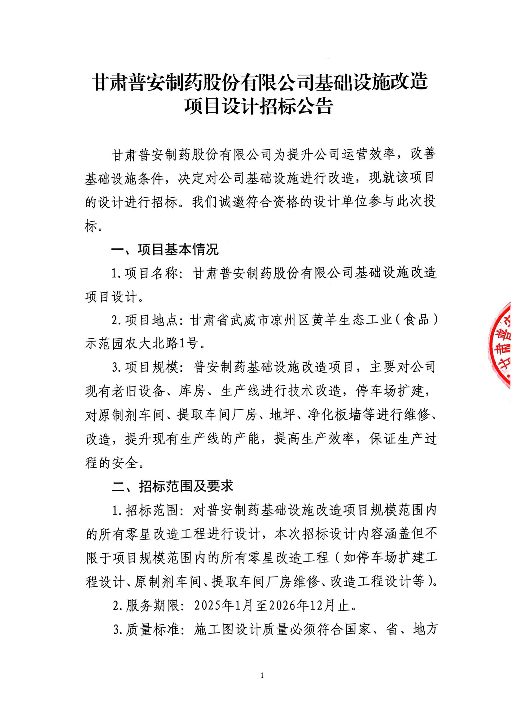 甘肅普安制藥股份有限公司基礎(chǔ)設(shè)施改造項(xiàng)目設(shè)計(jì)招標(biāo)公告