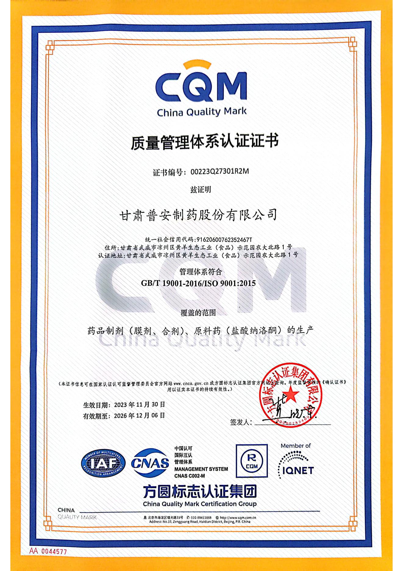 質(zhì)量管理體系認(rèn)證證書